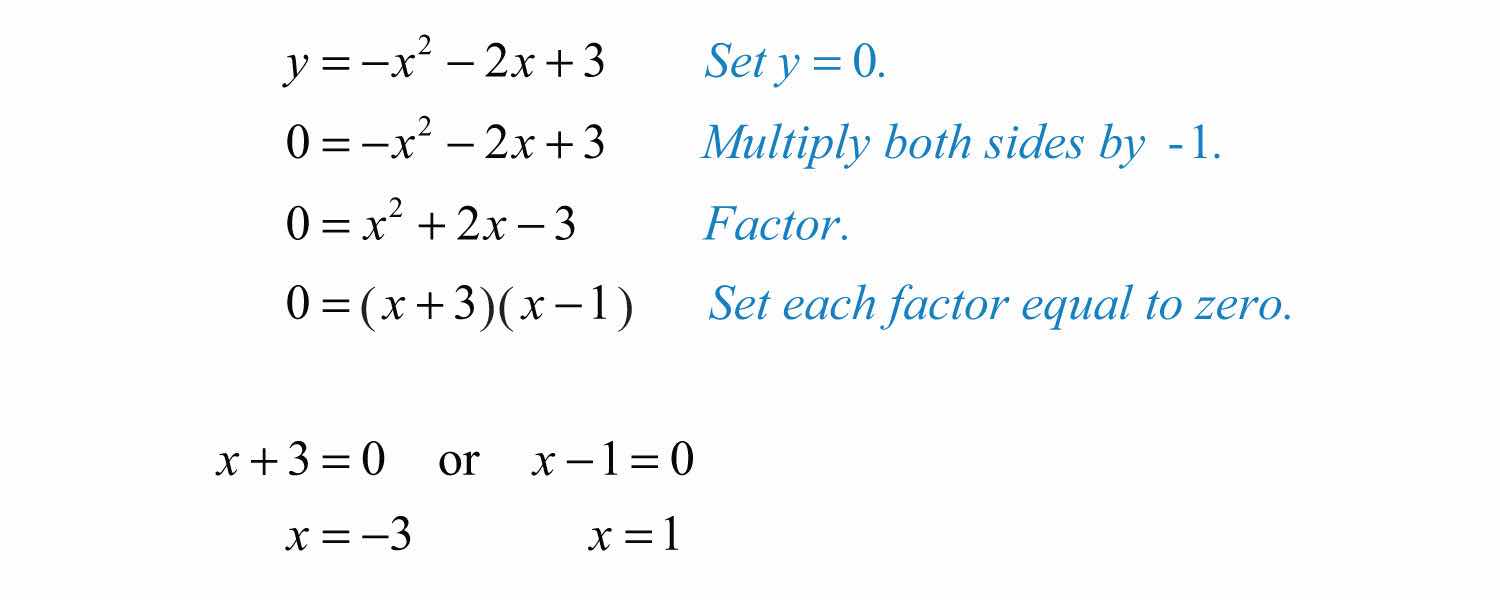 Here when y = 0, we obtain two solutions. There are two x-intercepts, (−3, 0) and (1, 0).