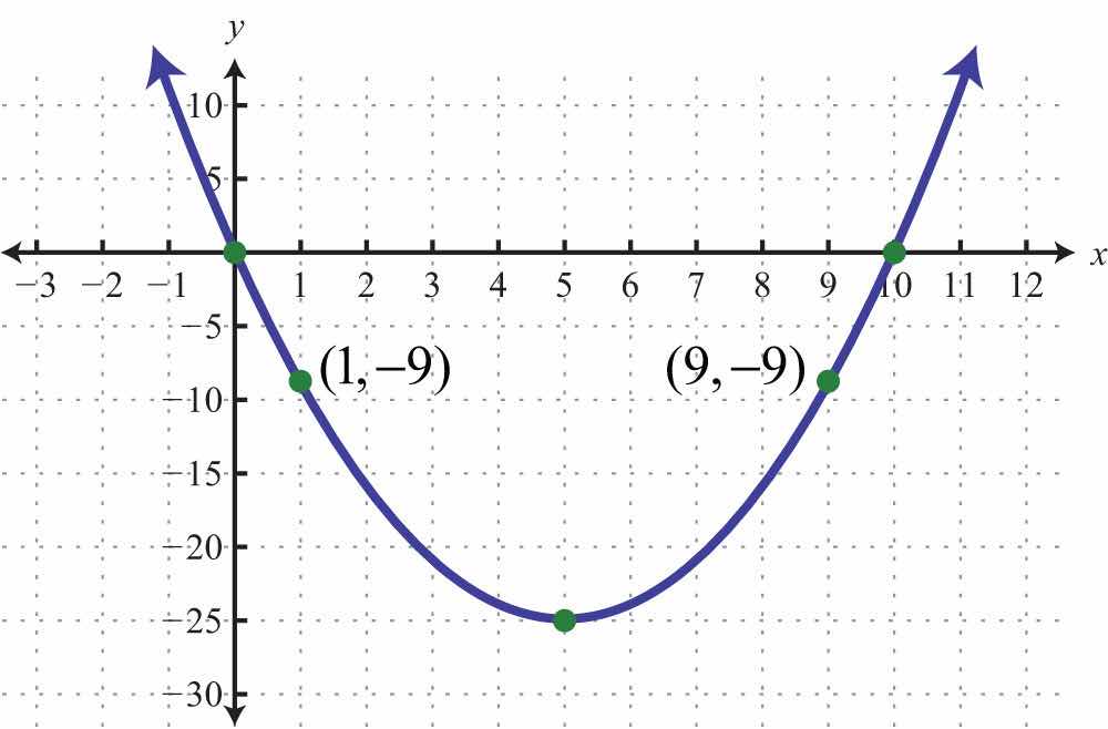 Therefore, the vertex is (3, 0), which happens to be the same point as the x-intercept. So far, we have only two points. To determine three more, choose some x-values on either side of the line of symmetry, x = 3 in this case. Choose x-values 1, 5, and 6.