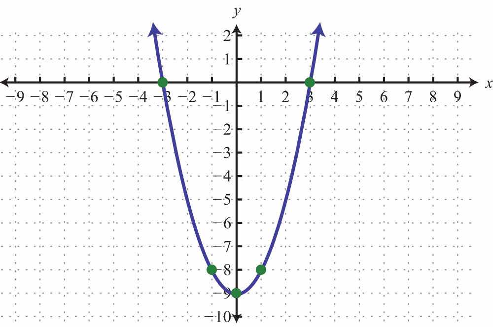 Solution: Note that a = −2: the parabola opens downward. Since c = −18, the y-intercept is (0, −18). To find the x-intercepts, set y = 0.