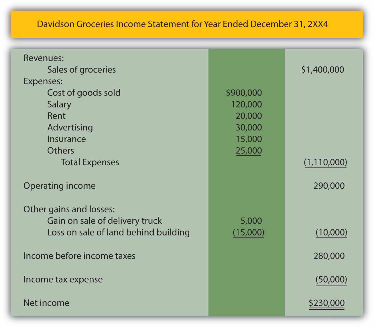 An example of an income statement for a small convenience store is shown in Figure 3.1 "Income Statement". Note that the name of the company, the identity of the statement, and the period of time reflected are apparent. Although this is only an illustration, it is quite similar to the income statements created by virtually all business organizations in the United States and many other countries.