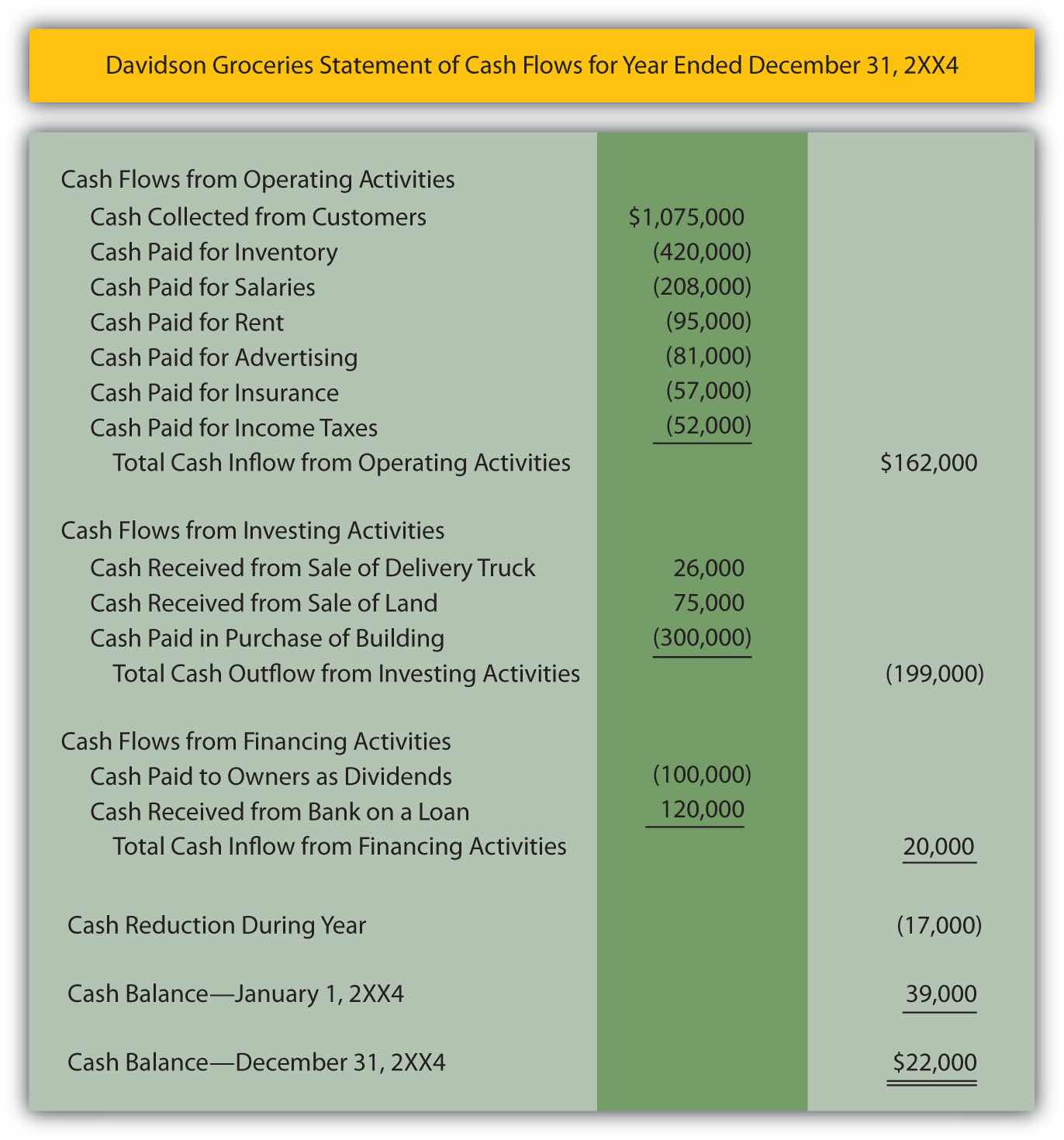 Answer: Outside decision makers place considerable emphasis on a company’s ability to create significant cash inflows and then wisely apply that money. Figure 3.6 "Statement of Cash Flows" presents an example of that information in a statement of cash flows for Davidson Groceries for the year ended December 31, 2XX4. Note that all the cash changes are divided into three specific sections: operating activitiesA statement of cash flow category used to disclose cash receipts and disbursements arising from the primary activities of the reporting organization., investing activitiesA statement of cash flow category used to disclose cash receipts and disbursements arising from an asset transaction other than one relating to the primary activities of the reporting organization., and financing activitiesA statement of cash flow category used to disclose cash receipts and disbursements arising from a liability or stockholders’ equity transaction other than one relating to the primary activities of the organization..
