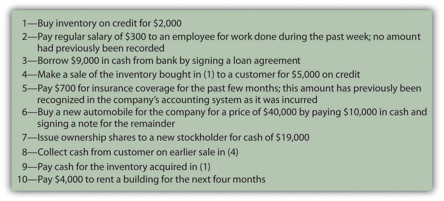 For example, all the occurrences listed in Figure 4.1 "Transactions Frequently Encountered" are typical transactions that any company might encounter. Each causes some measurable effect on a company’s assets, liabilities, revenues, expenses, gains, losses, capital stock, or dividends paid. The accounting process begins with an analysis of each transaction to determine the financial changes that took place. Was revenue earned? Did a liability increase? Has an asset been acquired?