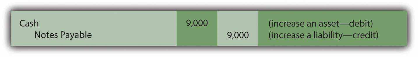 Answer: As always, recording begins with an analysis of the transaction. Here, cash increases as the result of the incurred debt (notes payable). Cash—an asset—increases $9,000, which is shown as a debit. The company’s notes payable balance also goes up by the same amount. As a liability, the increase is recorded through a credit. By using debits and credits in this way, the financial effects are entered into the accounting records.