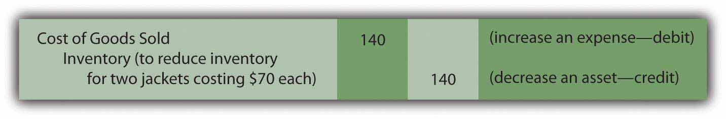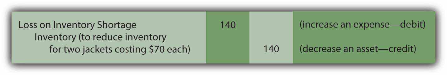 An adjustment is necessary when the count does not agree with the perpetual inventory balance. To illustrate, assume that company records indicate that sixty-five ski jackets are currently in stock costing $70 apiece. The physical inventory finds that only sixty-three items are actually on hand. The inventory account must be reduced (credited) by $140 to mirror the shortfall (two missing units at $70 each).