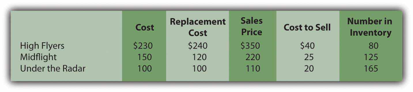 Purchase Value. In some cases, often because of bad timing, a company finds that it has paid an excessive amount for inventory. Usually as the result of an increase in supply or a decrease in demand, replacement cost drops after an item is acquired. To illustrate, assume that Builder Company—the manufacturer of bicycle Model XY-7—has trouble selling the expected quantity of this style to retail stores because the design is not viewed as attractive. Near the end of the year, Builder reduces the wholesale price offered for this model by $50 in hopes of stimulating sales. Rider Inc. bought a number of these bicycles earlier at a total cost of $260 each but now, before the last unit is sold, could obtain an identical product for only $210. The bicycle held in Rider’s inventory is literally worth less than what the company paid for it. The purchase value, as demonstrated by replacement cost, has fallen to a figure lower than its historical cost.