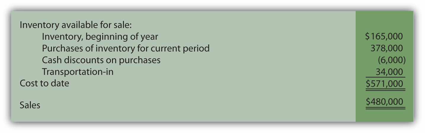 If no sales had taken place, the inventory on hand would have cost $571,000 as shown by the ledger accounts. Sales did occur prior to the hurricane and a significant amount of merchandise was removed by the customers. However, the $480,000 balance shown in the sales T-account does not reflect the cost of the inventory items that were surrendered. It is a retail amount, the summation of the price charged for all the merchandise sold during the year to date.