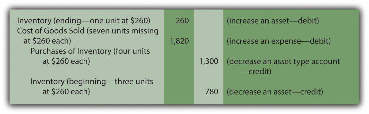 | Inventory (beginning balance remains unadjusted during the period): | 3 units at $260 each or $780 |