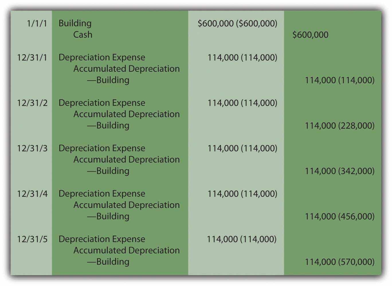 The entries to record the cost of acquiring this building and the annual depreciation expense over the five-year life are as follows. The straight-line method is used here to determine the individual allocations to expense. Now that students should be familiar with using debits and credits for recording, the number in parenthesis is included (where relevant to the discussion) to indicate the total account balance after the entry is posted. As indicated in an earlier chapter, revenues, expenses, and dividends are closed out each year. Thus, the depreciation expense reported on each income statement measures only the expense assigned to that period.