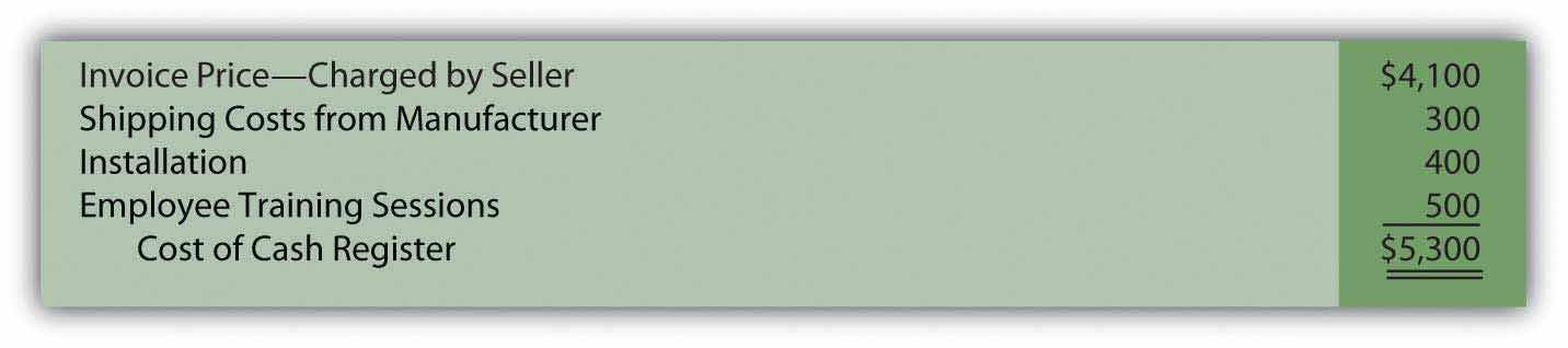 As another example, the cost of a new cash register might well include shipping charges, installation fees, and training sessions to teach employees to use the asset. These costs all meet the criterion for capitalization. They appear to be normal and necessary to permit use of the asset for its intended purpose. Hence, a new cash register bought for $4,100 might actually be reported as an asset by its owner at $5,300 as follows: