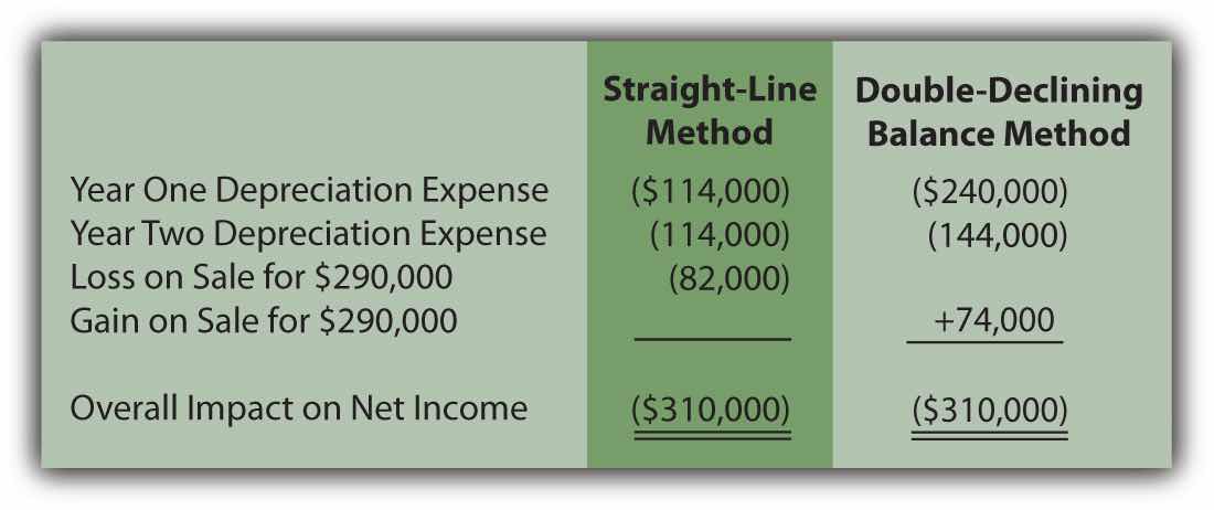 Although the annual amounts are quite different, the overall net income is never affected by the allocation pattern in use. In this example, a building was bought for $600,000 and later sold after two years for $290,000. Thus, net income for the entire period of use must be reduced by the $310,000 difference regardless of the approach applied.