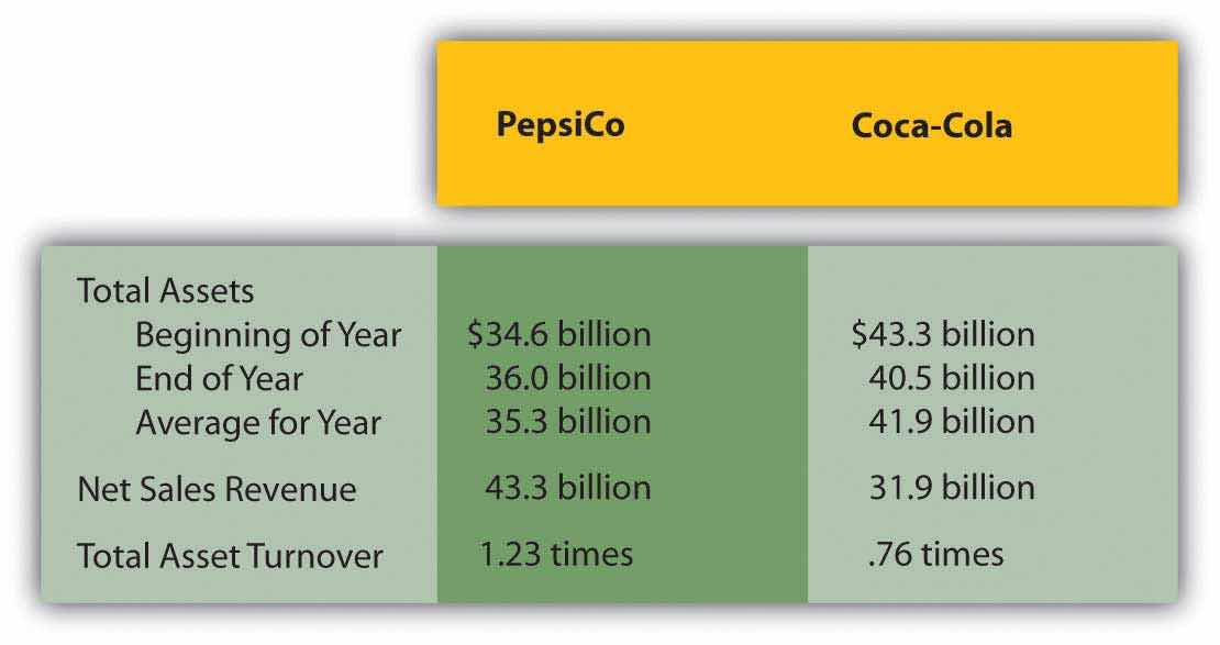 total asset turnover = sales revenue/average total assetsFor example, here is information reported for 2008 by PepsiCo Inc. and The Coca-Cola Company. Based on this information, the total asset turnover can be computed for each company.