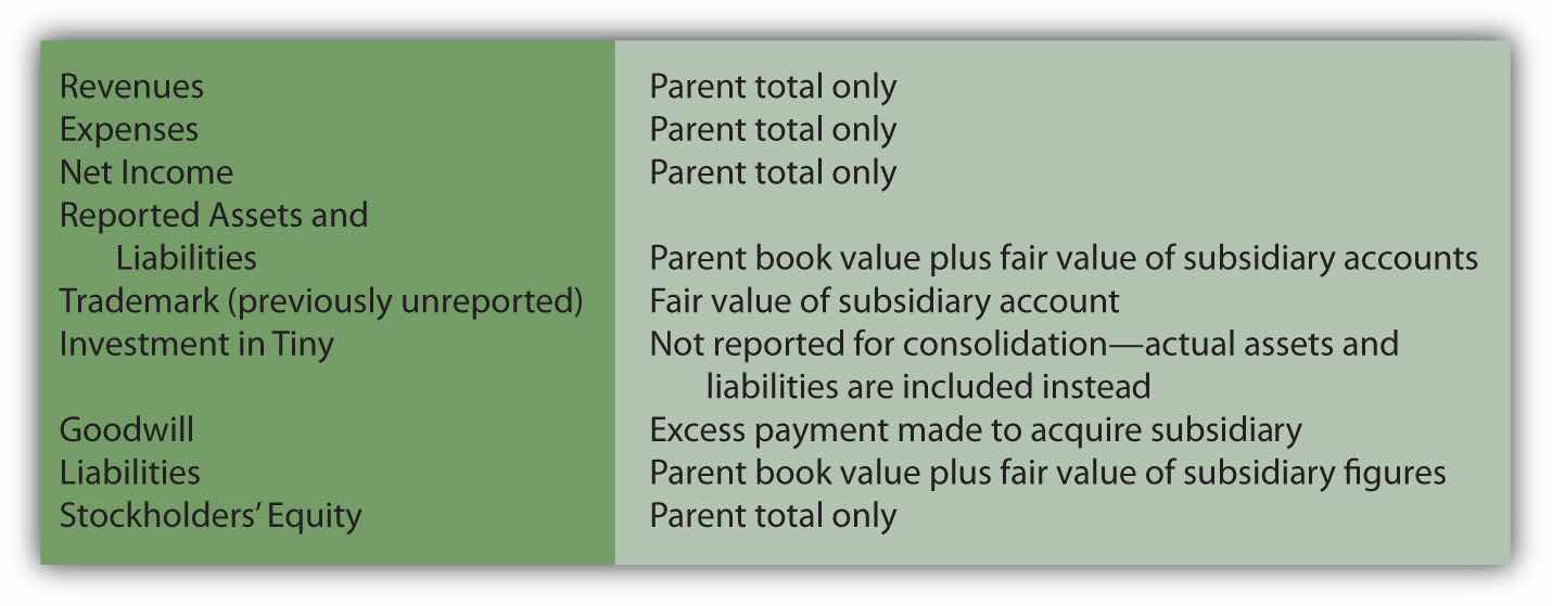 Question: To illustrate the consolidation process, assume that Tiny has earned revenues of $800,000 and incurred expenses of $500,000 during the year to date. In addition, the company reports a single asset, land costing $400,000 but with a $720,000 fair value. The only liability is a $300,000 note payable. Thus, the company’s net book value is $100,000 ($400,000 land less $300,000 note payable). Tiny also owns the rights to a well-known trademark that has no book value because it was developed many years ago at little or no cost. However, it is now estimated to be worth $210,000.