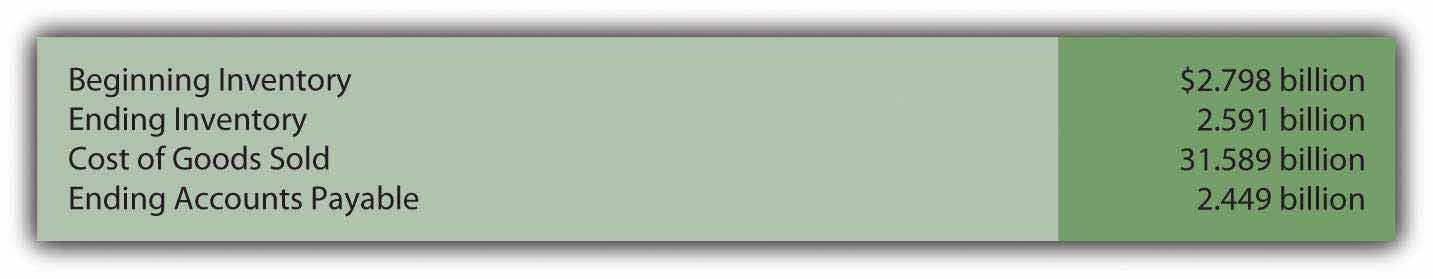 accounts payable/average daily purchases $2.449 billion/$85.978 million = 28.48 days.To evaluate that number, a decision maker would need to compare it to previous time periods, the typical payment terms for a business in that industry, and comparable figures from other similar corporations. Interestingly, the same computation for the previous year (2007) showed that Safeway was taking over thirty-four days to pay off its accounts payable during that period.