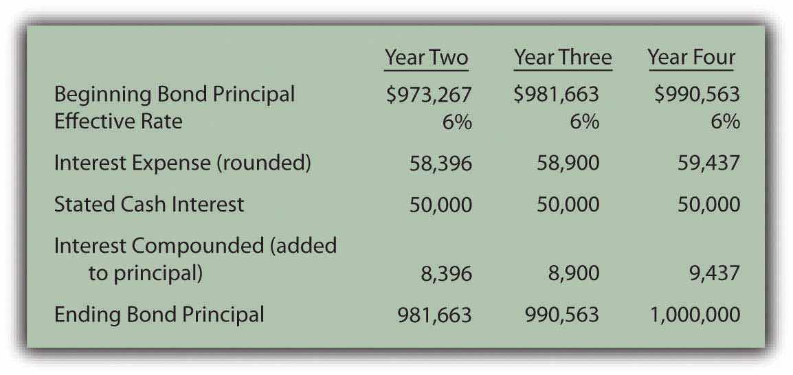 The effective rate is reflected in the financial statements by recognizing interest in Year One of $57,921 (rounded), which is the $965,346 principal times 6 percent. The $7,921 difference between the effective interest expense of $57,921 and the cash interest payment of $50,000 will eventually be paid but not until the end of the four-year term when $1 million rather than $965,346 is conveyed to the bondholders. Therefore, at the end of Year One, this extra $7,921 is compounded. Only the portion of this interest that is not being paid is added to the principal. Earlier, with the zero-coupon bond, the entire amount of interest was compounded because no cash interest payment was made.
