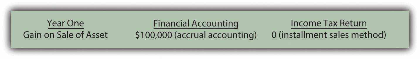Answer: According to U.S. GAAP, this $100,000 gain is recognized in Year One based on accrual accounting. The earning process is substantially complete and the amount to be collected can be reasonably estimated. However, if certain conditions are met, income tax laws permit taxpayers to report such gains using the installment sales method.The installment sales method can also be used for financial reporting purposes but only under very limited circumstances. In simple terms, the installment sales method allows a seller to delay the reporting of a gain until cash is collected. The gain is recognized proportionally based on the amount of cash received. If 20 percent is collected in Year Four, then 20 percent of the gain becomes taxable in that year.