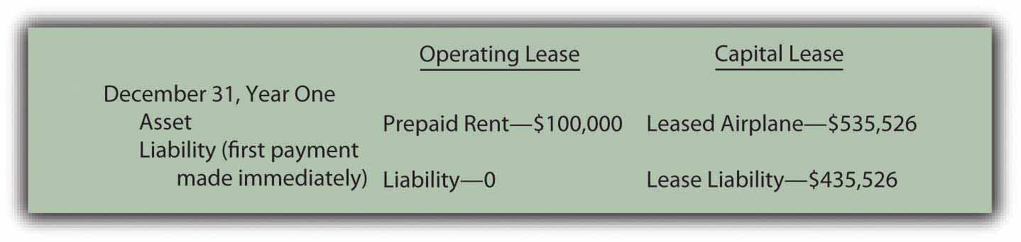 Because the first payment has been made, no liability is reported on Abilene’s balance sheet although the contract specifies that an additional $600,000 in payments will be required over the subsequent six years. In addition, the airplane itself is not shown as an asset by the lessee because this operating lease is viewed as the equivalent of a rent and not a purchase.