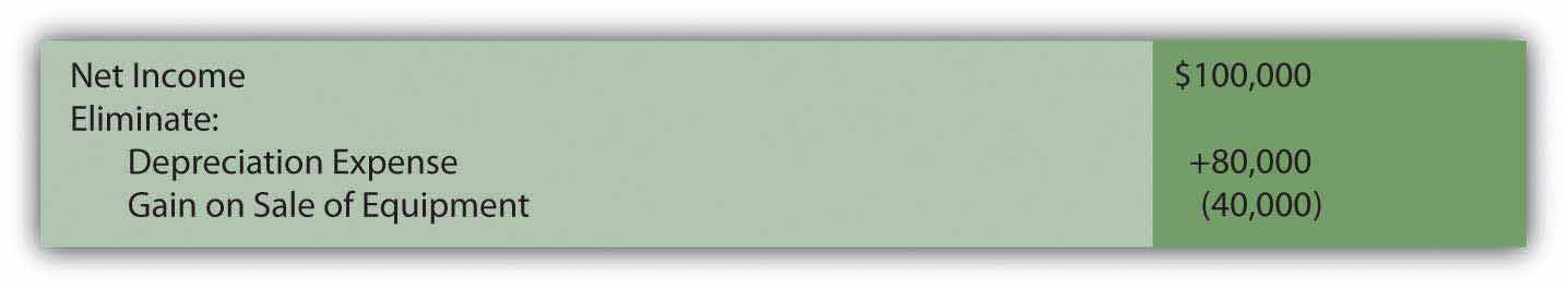 The gain on sale of equipment also exists within reported income but as a positive figure. It helped increase profits this period. To eliminate this gain, the $40,000 amount must be subtracted. The cash flows resulting from this transaction came from an investing activity and not an operating activity.
