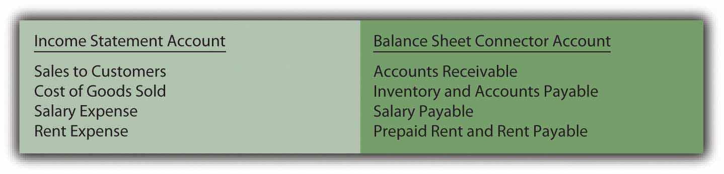 Connector accounts are mostly receivables, payables, and prepaid expenses. For example, see Figure 17.5 "Common Connector Accounts for Liberto’s Four Income Statement Balances".