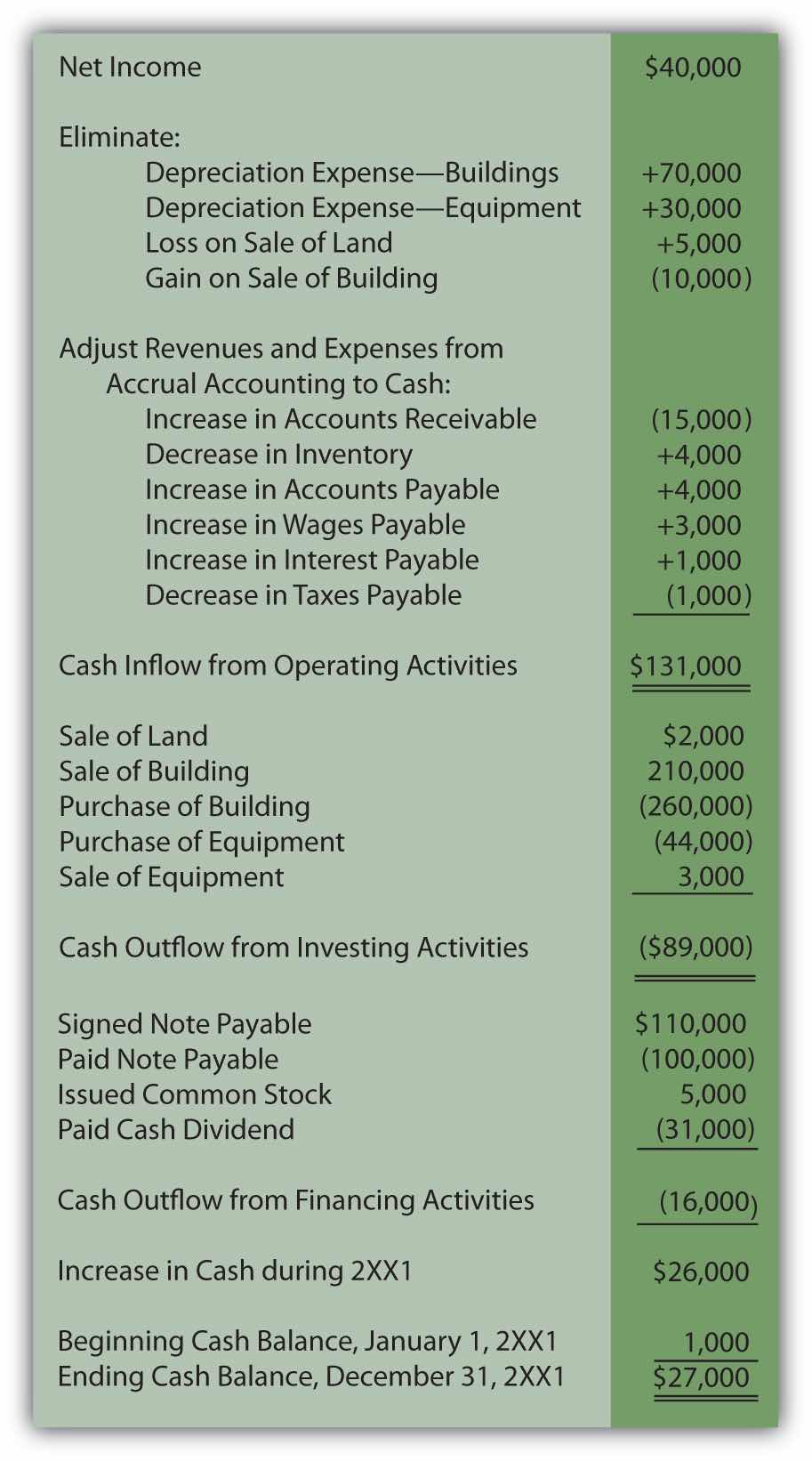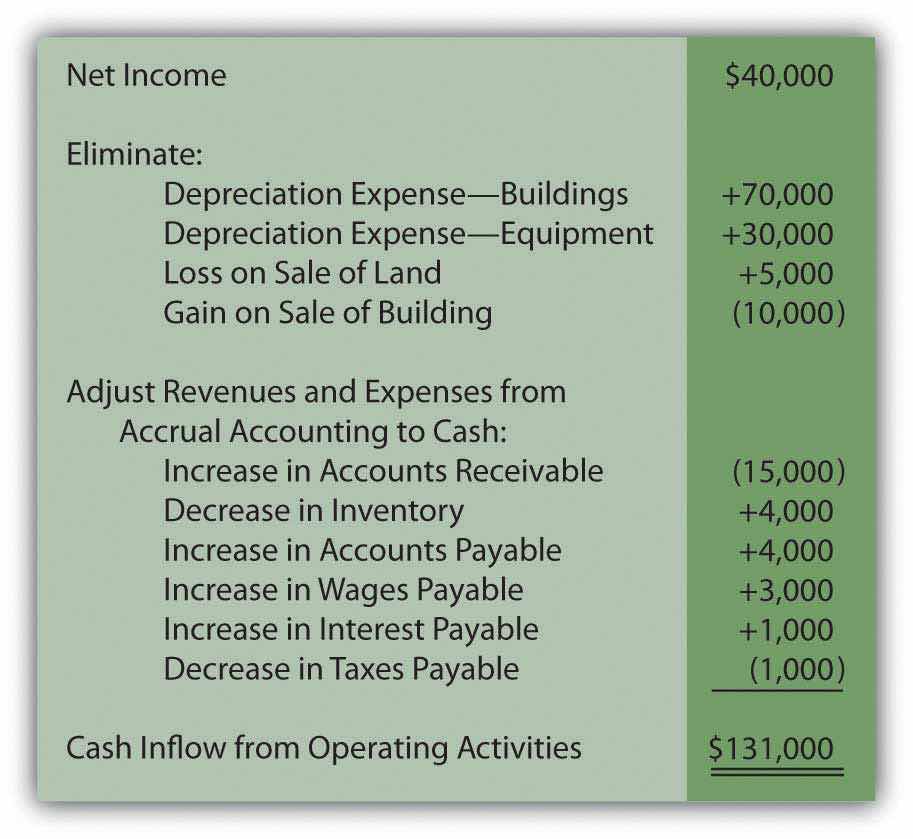 Liberto’s income statement reported net income of $100,000. However, the cash generated by operating activities during this same period was $133,000. The conversion from accrual accounting to operating cash inflows and outflows required three steps.