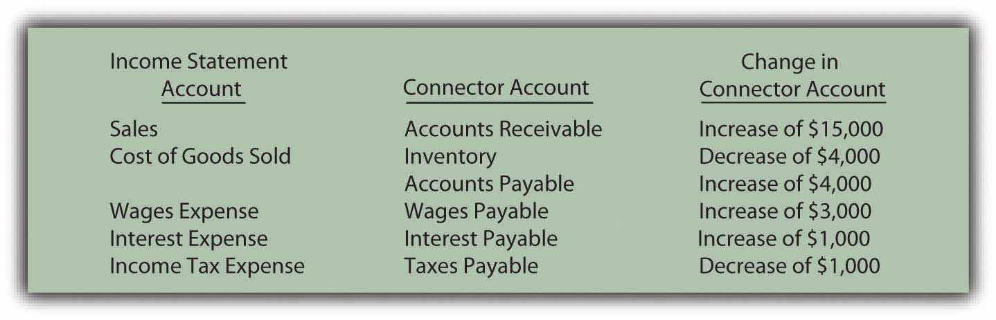 Each income statement account (other than the noncash and nonoperating numbers that have already been eliminated) has at least one asset or liability that is recorded between the time of accounting recognition and the exchange of cash. The changes in these connector accounts are used to convert the individual income statement figures to their cash equivalents. Basically, the increase or decrease is removed to revert the reported number back to the amount of cash involved.