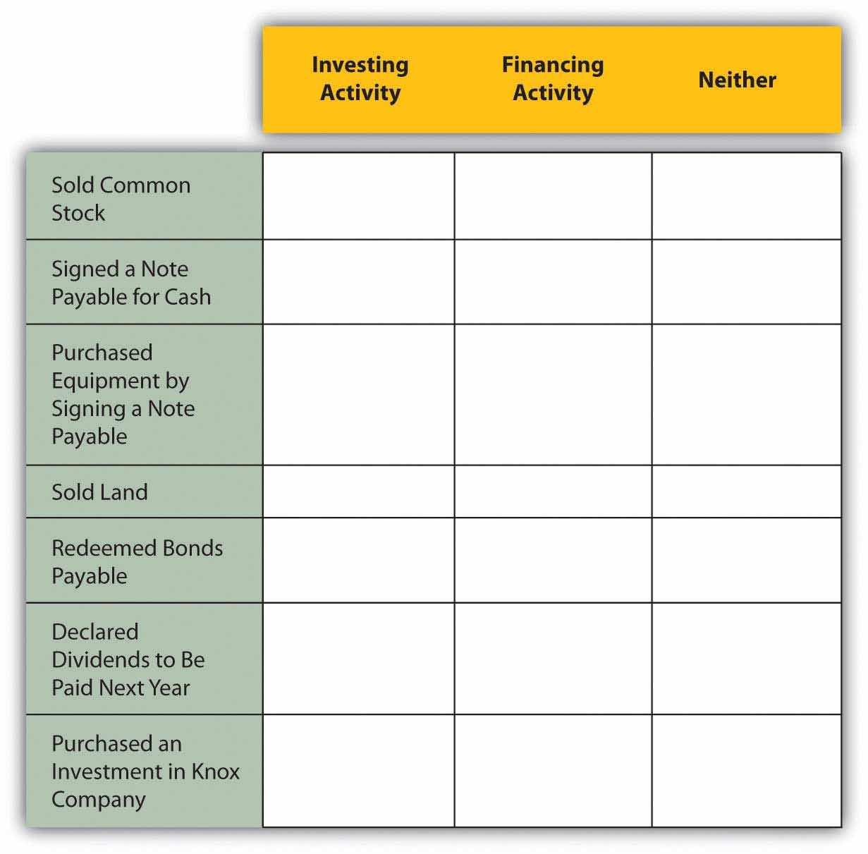 Killian Corporation had several transactions during the year that impacted long-term assets and liabilities and owners’ equity. Determine if each of the following items would be shown in investing activities, financing activities or neither.