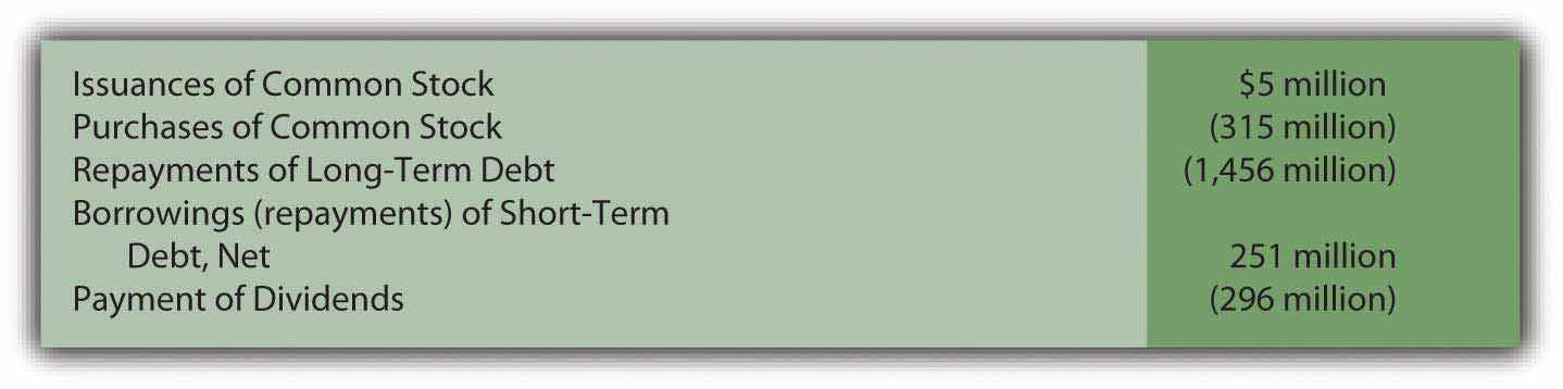 Sara Lee reported five financing activity cash flows for the year ended June 28, 2008. As can be seen in the specific information provided on its statement of cash flows, this company spent nearly $1.5 billion to repay liabilities, another $315 million to repurchase its own stock, and $296 million as dividend payments. Significant information that is readily apparent on this statement.