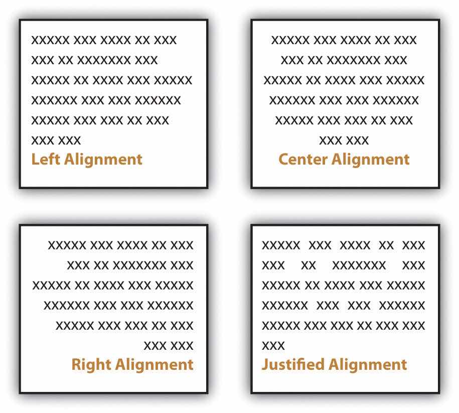 Most business and academic documents use left alignmentText where all lines begin on the same imaginary vertical line on the left side of the paper. as the standard format. The other three options are used less often but can provide effective alternatives in specific situations. For example, you will usually center-align text on a title page; you will typically right-align the page numbers in a table of contents, and you might justify text when you want to fit the maximum amount of text within the given space (such as within a newspaper article). Both center-aligned text and right-aligned text should be used sparingly since they are difficult to read in large amounts.