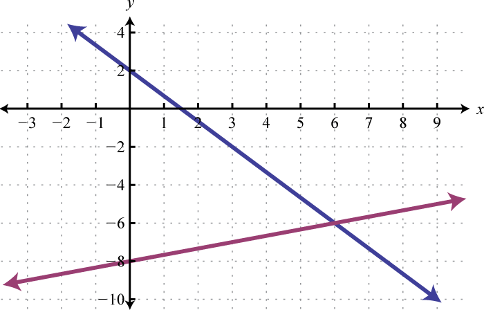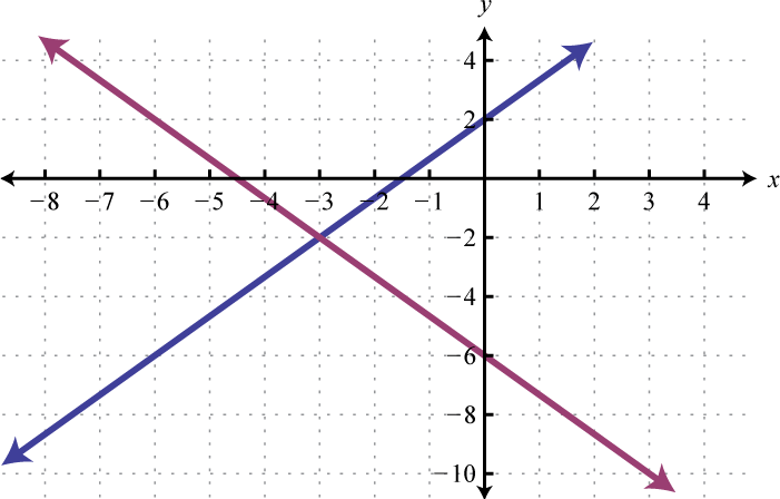 To summarize, linear systems described in this section consist of two linear equations each with two variables. A solution is an ordered pair that corresponds to a point where the two lines intersect in the rectangular coordinate plane. Therefore, one way to solve linear systems is by graphing both lines on the same set of axes and determining the point where they cross. This describes the graphing methodA means of solving a system by graphing the equations on the same set of axes and determining where they intersect. for solving linear systems.