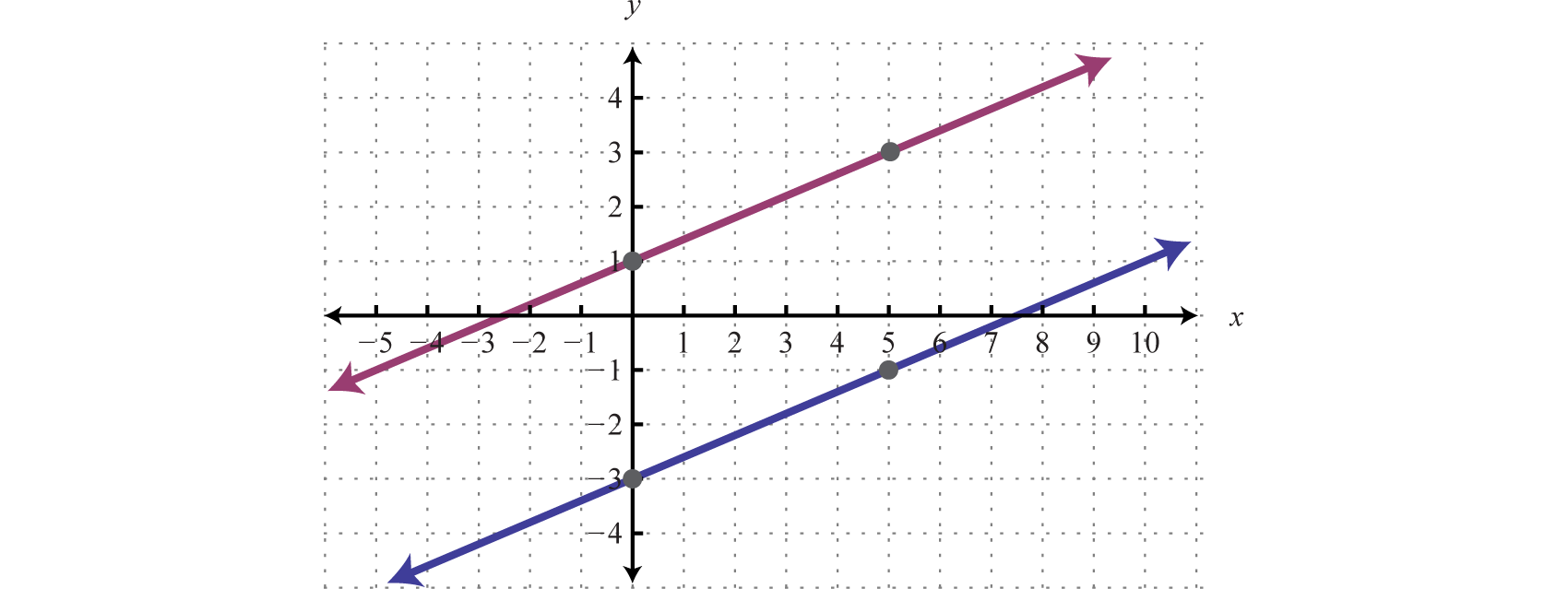 The graphing method for solving linear systems is not ideal when a solution consists of coordinates that are not integers. There will be more accurate algebraic methods in sections to come, but for now, the goal is to understand the geometry involved when solving systems. It is important to remember that the solutions to a system correspond to the point, or points, where the graphs of the equations intersect.