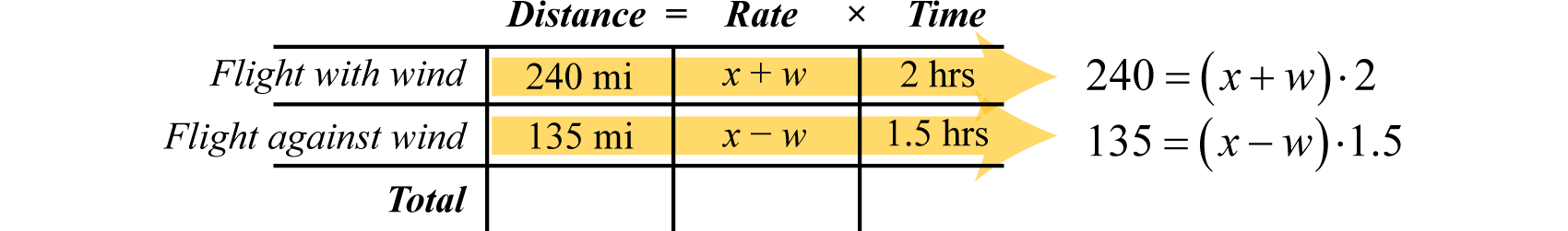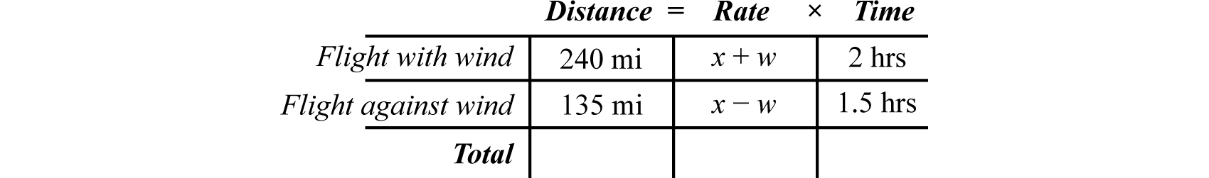 Recall that the distance traveled is equal to the average rate times the time traveled at that rate, . These uniform motion problems usually have a lot of data, so it helps to first organize that data in a chart and then set up a linear system. In this section, you are encouraged to use two variables.