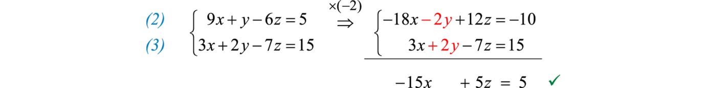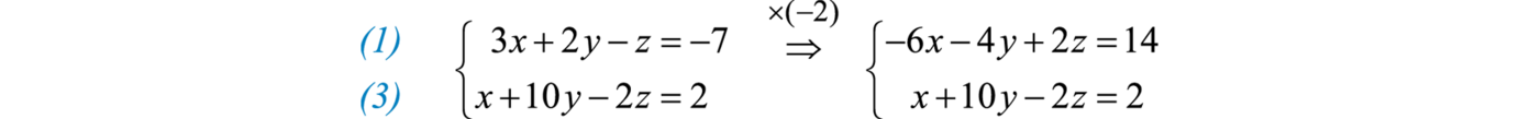 Step 2: Choose any other two equations and eliminate the same variable. We can line up z to eliminate again if we group −2 times the first equation with the third equation.