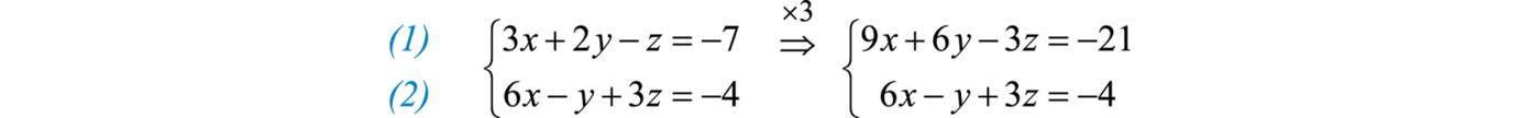 Step 1: Choose any two of the equations and eliminate a variable. In this case, we can line up the variable z to eliminate if we group 3 times the first equation with the second equation.