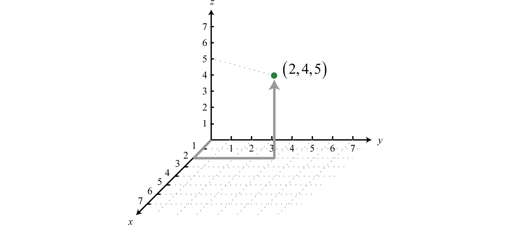 The ordered triple indicates position relative to the origin (0, 0, 0), in this case, 2 units along the x-axis, 4 units parallel to the y-axis, and 5 units parallel to the z-axis. A linear equation with three variablesAn equation that can be written in the standard form where a, b, c, and d are real numbers. is in standard form if where a, b, c, and d are real numbers. For example, is in standard form. Solving for z, we obtain and can consider both x and y to be the independent variables. When graphed in three-dimensional space, its graph will form a straight flat surface called a planeAny flat two-dimensional surface..