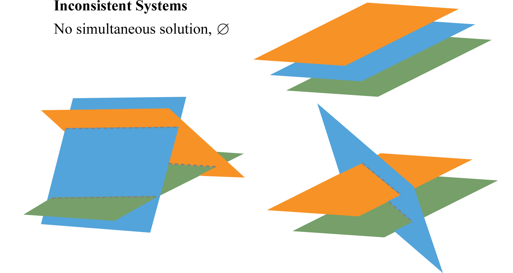 A system with no solutions is an inconsistent system. Given three planes, no simultaneous solution can occur in a number of ways.
