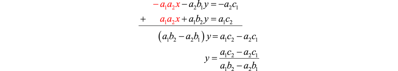 We can solve linear systems with two variables using determinants. We begin with a general 2×2 linear system and solve for y. To eliminate the variable x, multiply the first equation by and the second equation by .