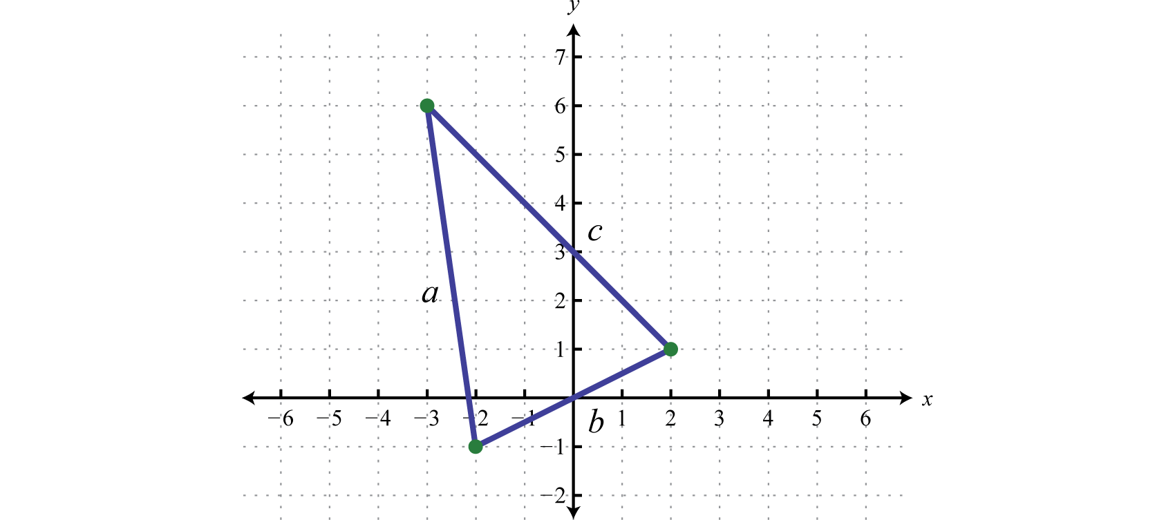 The formula for the perimeter of a triangle is where a, b, and c represent the lengths of each side. Plotting the points we have,