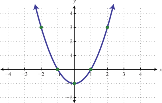 Since a = 1, the parabola opens upward. Furthermore, c = −1, so the y-intercept is To find the x-intercepts, set