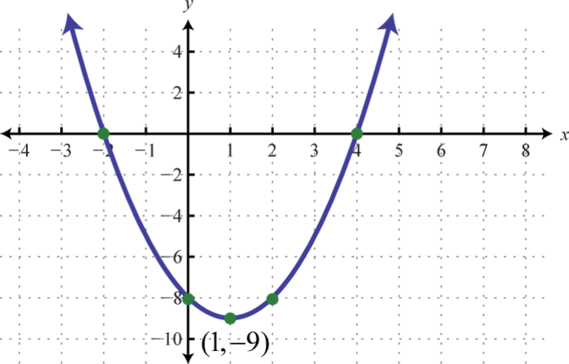 The vertex is (4, −2). Therefore, the minimum y-value of −2 occurs where x = 4, as illustrated below: