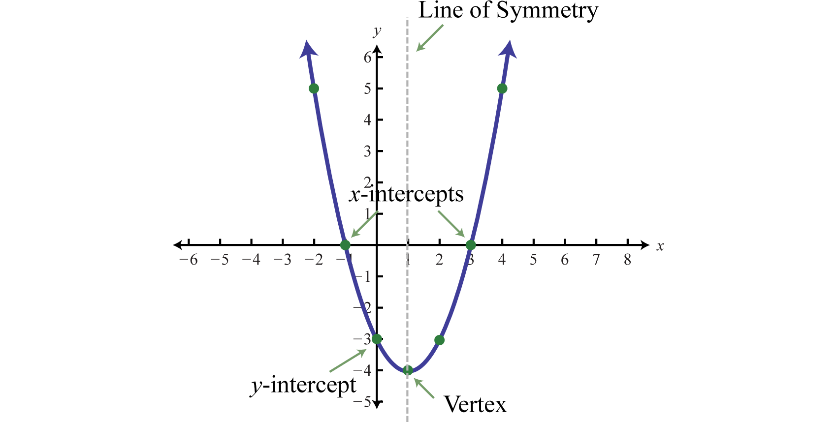 When graphing parabolas, we want to include certain special points in the graph. The y-intercept is the point where the graph intersects the y-axis. The x-intercepts are the points where the graph intersects the x-axis. The vertexThe point that defines the minimum or maximum of a parabola. is the point that defines the minimum or maximum of the graph. Lastly, the line of symmetryThe vertical line through the vertex, , about which the parabola is symmetric. (also called the axis of symmetryA term used when referencing the line of symmetry.) is the vertical line through the vertex, about which the parabola is symmetric.