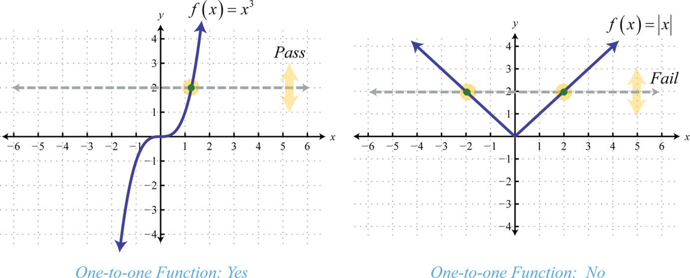 Recall that a function is a relation where each element in the domain corresponds to exactly one element in the range. We use the vertical line test to determine if a graph represents a function or not. Functions can be further classified using an inverse relationship. One-to-one functionsFunctions where each value in the range corresponds to exactly one value in the domain. are functions where each value in the range corresponds to exactly one element in the domain. The horizontal line testIf a horizontal line intersects the graph of a function more than once, then it is not one-to-one. is used to determine whether or not a graph represents a one-to-one function. If a horizontal line intersects a graph more than once, then it does not represent a one-to-one function.