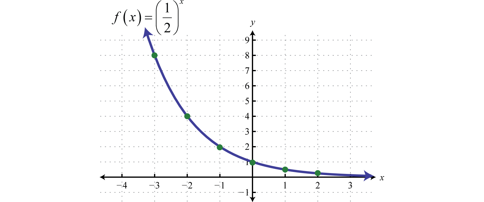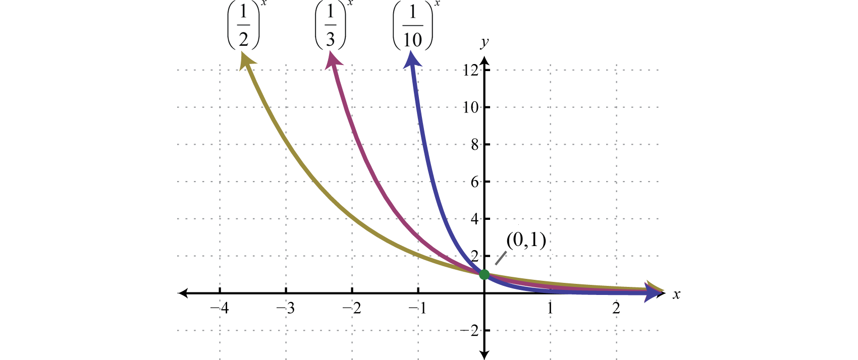 Reading the graph from left to right, it is interpreted as decreasing exponentially. The base affects the rate at which the exponential function decreases or decays. Below we have graphed , , and on the same set of axes.