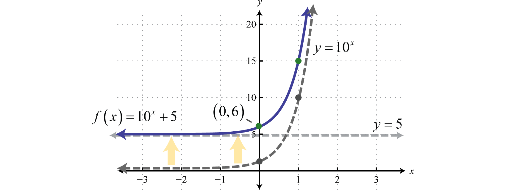 Note that the horizontal asymptote of the basic graph was shifted up 5 units to (shown dashed). Take a minute to evaluate a few values of x with your calculator and convince yourself that the result will never be less than 5.