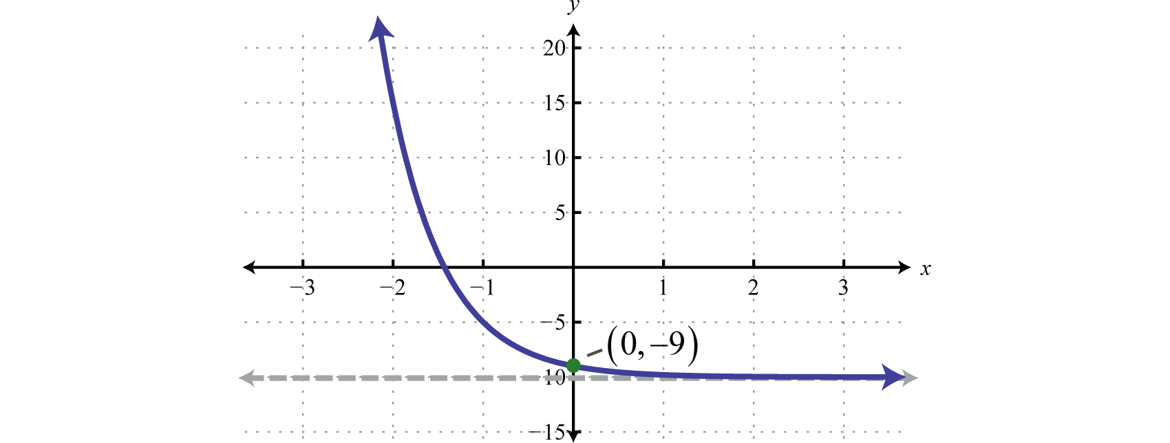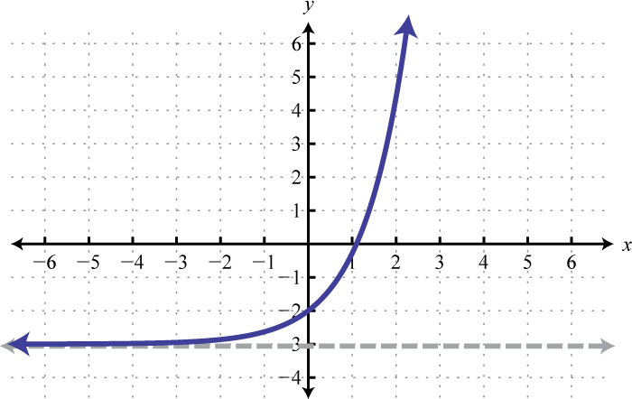 Note that the function is similar to the graph of The domain consists of all real numbers and the range consists of all positive real numbers. There is an asymptote at and a y-intercept at We can use the transformations to sketch the graph of more complicated exponential functions.