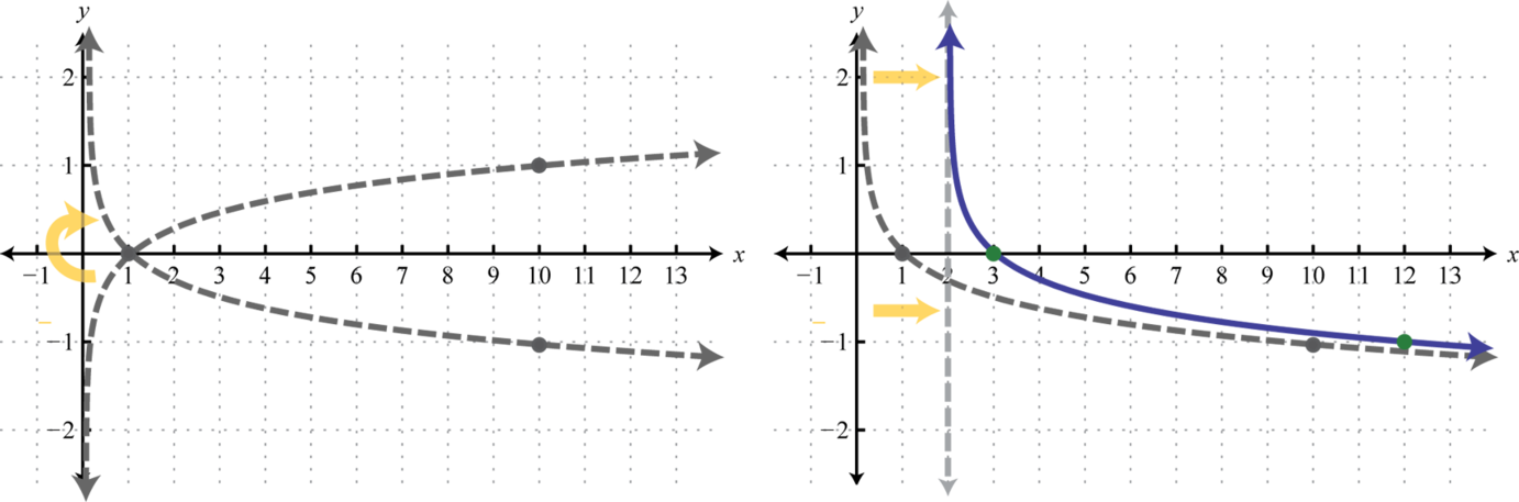 We can use the translations to graph logarithmic functions. When the base , the graph of has the following general shape: