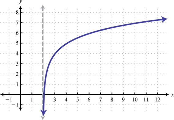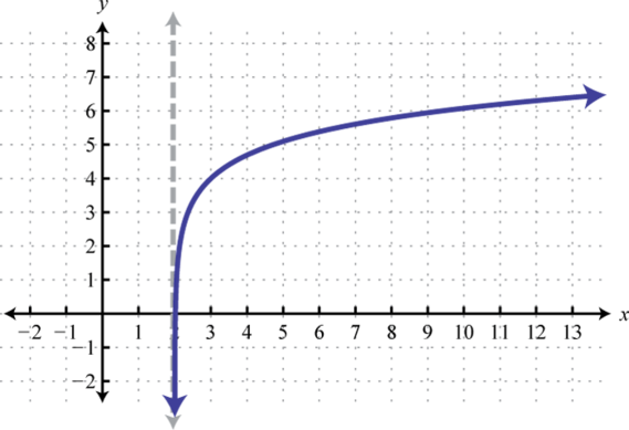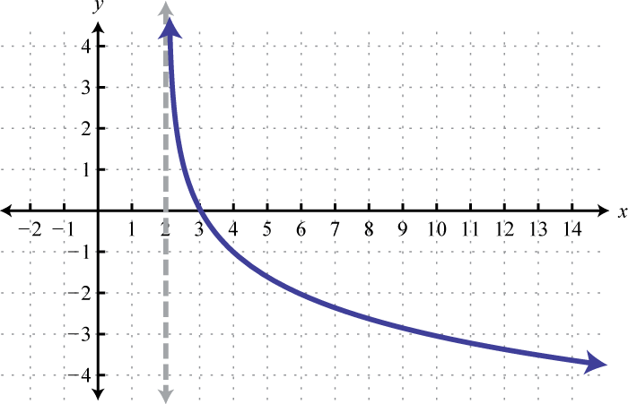 Here the vertical asymptote was shifted two units to the right. This defines the lower bound of the domain.