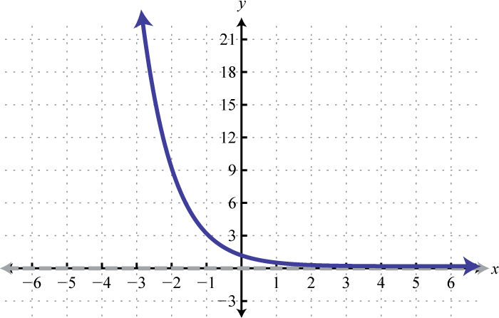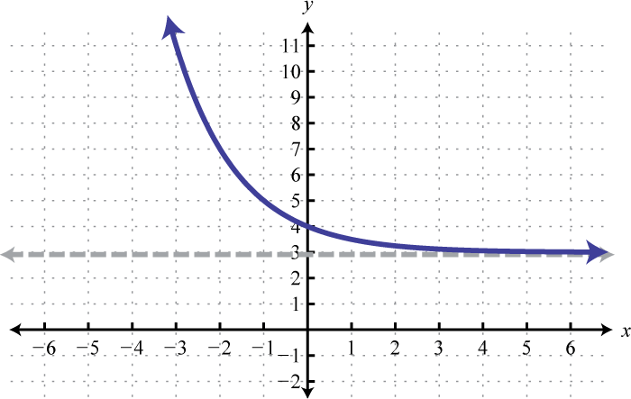 Sketch the exponential function. Draw the horizontal asymptote with a dashed line.