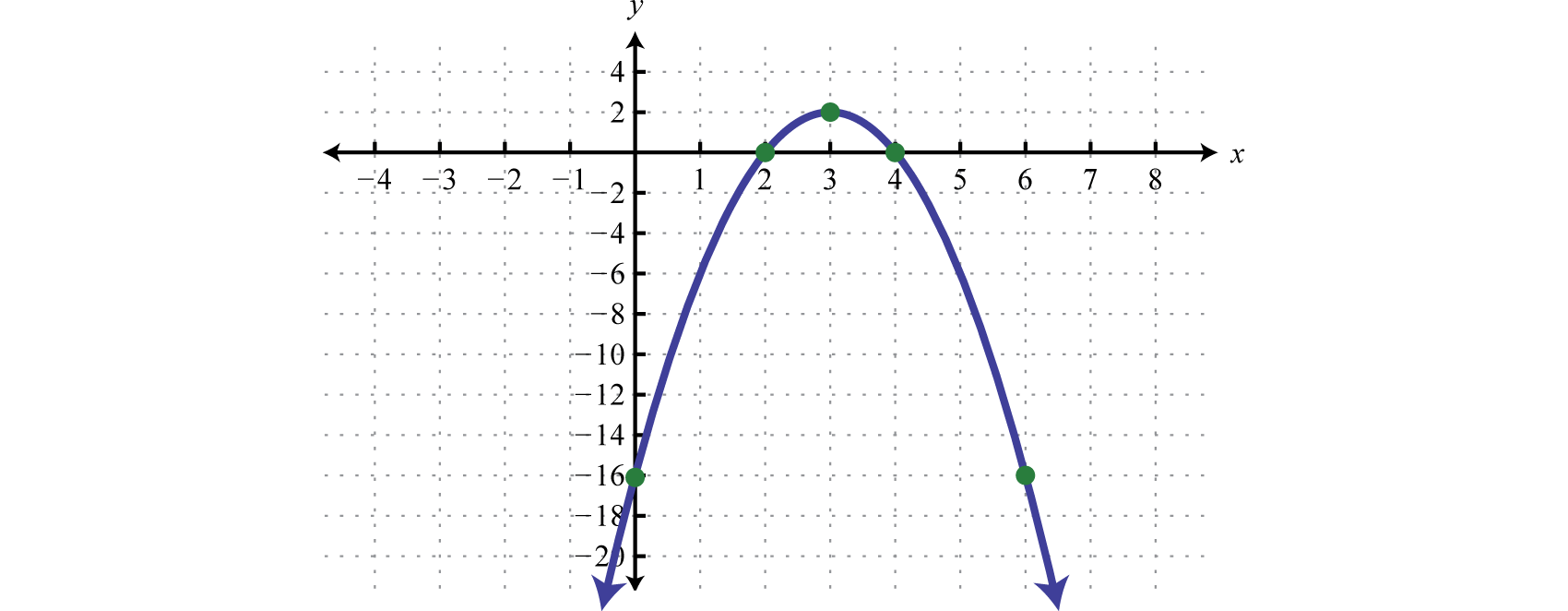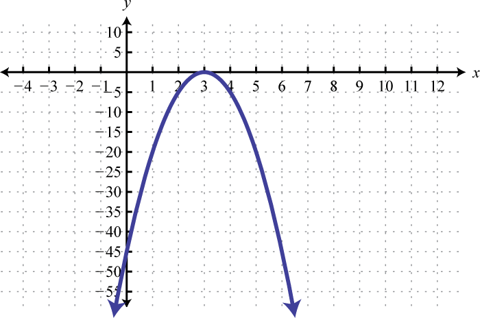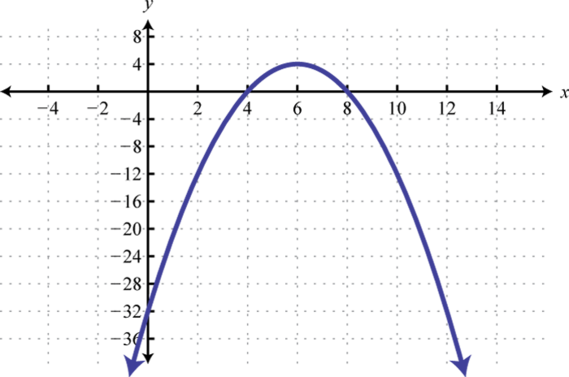 Recall that if the leading coefficient the parabola opens upward and if the parabola opens downward. In this case, and we conclude the parabola opens downward. Use general form to determine the y-intercept. When we can see that the y-intercept is From the equation in standard form, we can see that the vertex is To find the x-intercept we could use either form. In this case, we will use standard form to determine the x-values where ,