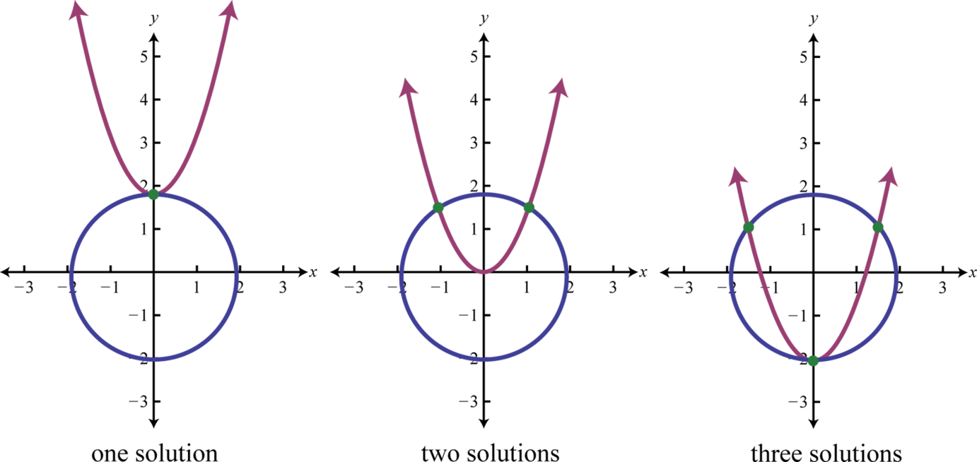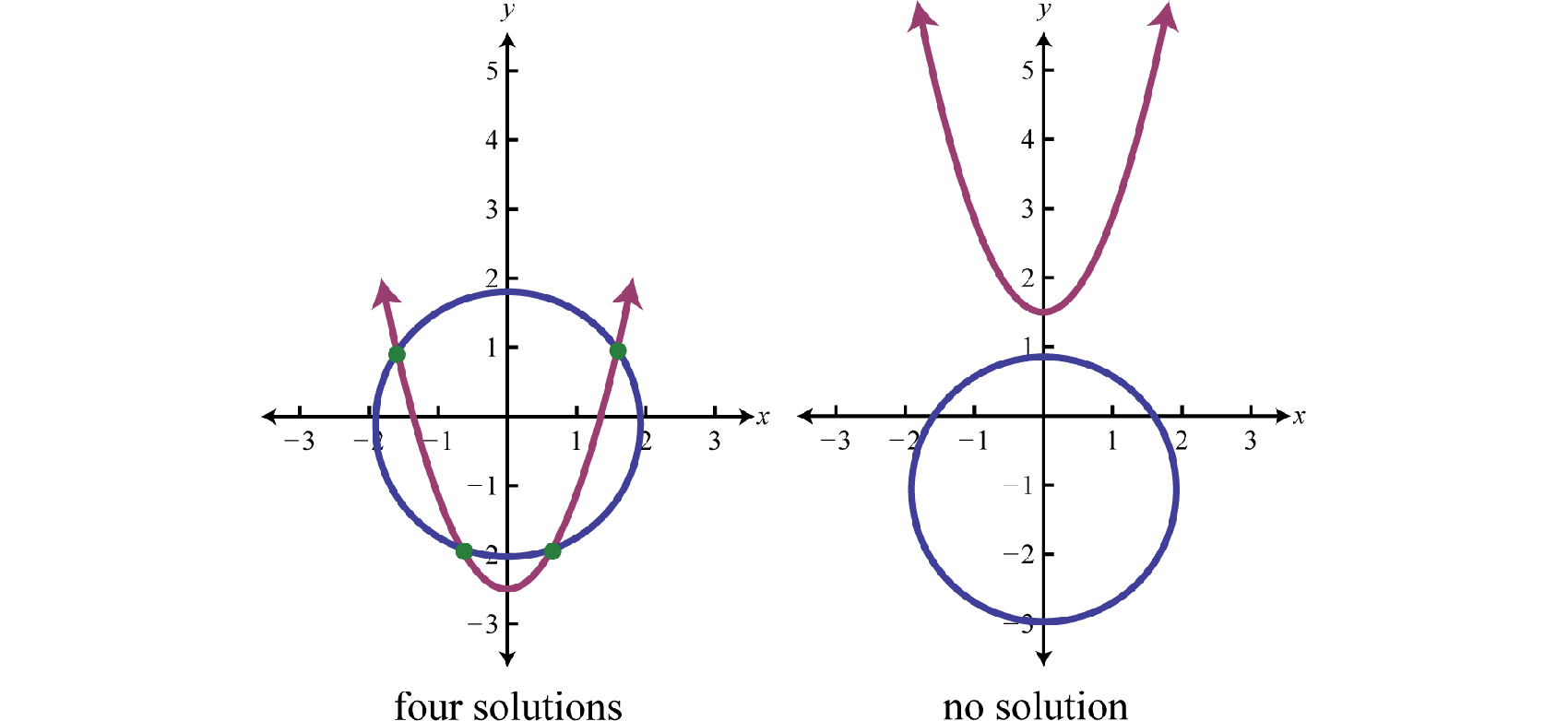 A system of equations where at least one equation is not linear is called a nonlinear systemA system of equations where at least one equation is not linear.. In this section we will use the substitution method to solve nonlinear systems. Recall that solutions to a system with two variables are ordered pairs that satisfy both equations.