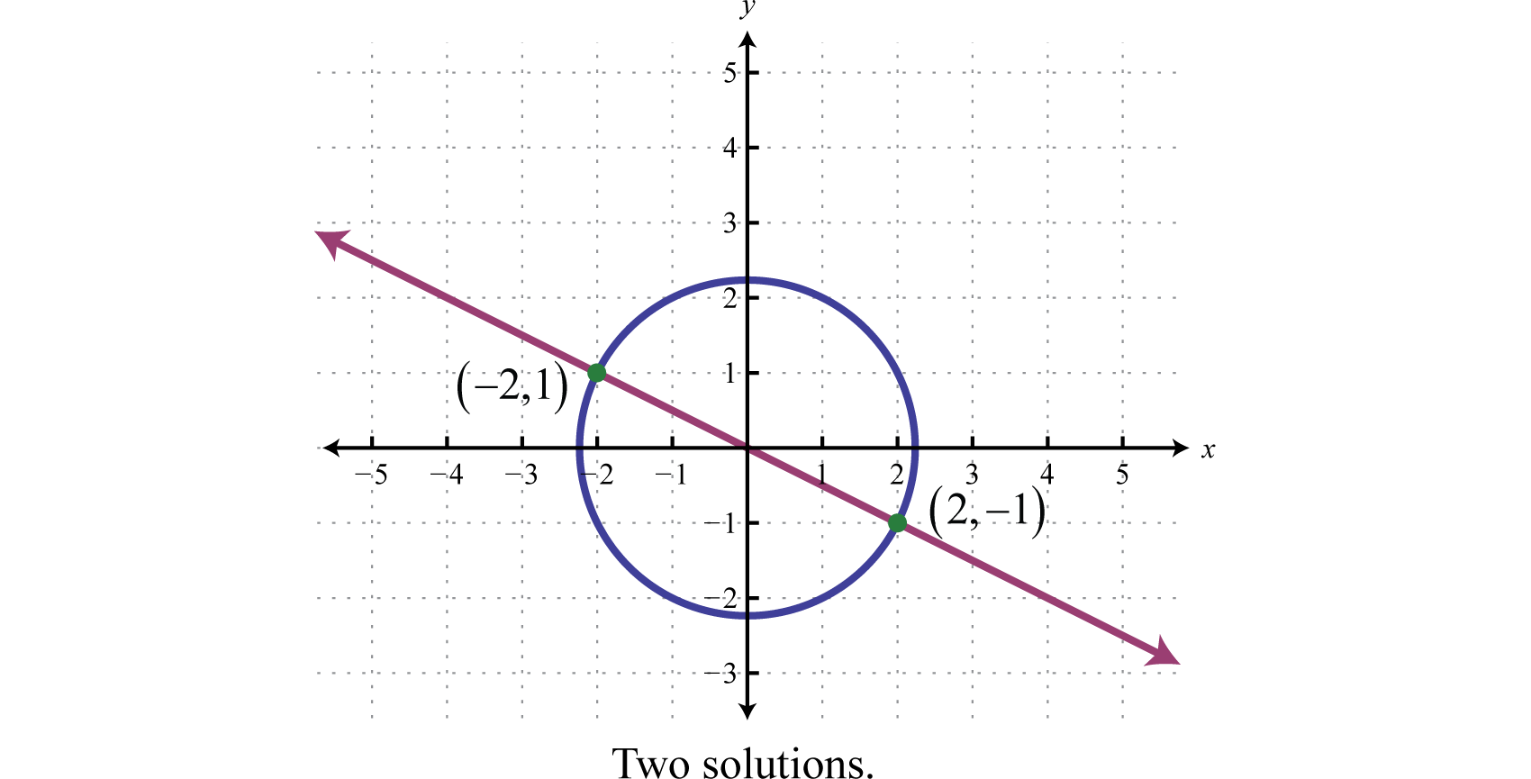 In the previous example, the given system consisted of a line and a circle. Graphing these equations on the same set of axes, we can see that the two ordered pair solutions correspond to the two points of intersection.
