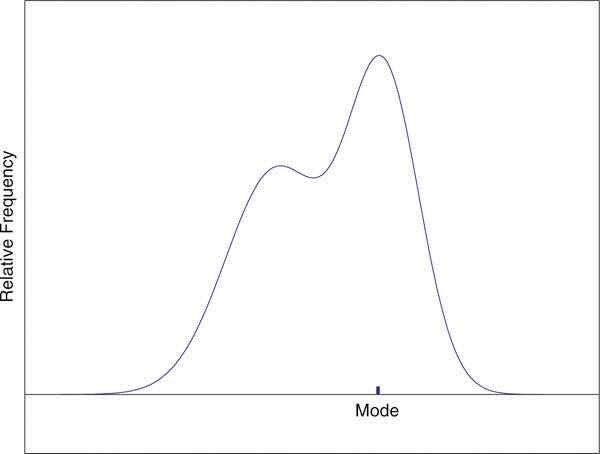 On a relative frequency histogram, the highest point of the histogram corresponds to the mode of the data set. Figure 2.9 "Mode" illustrates the mode.